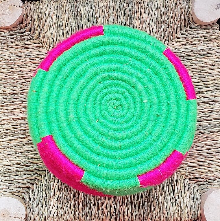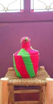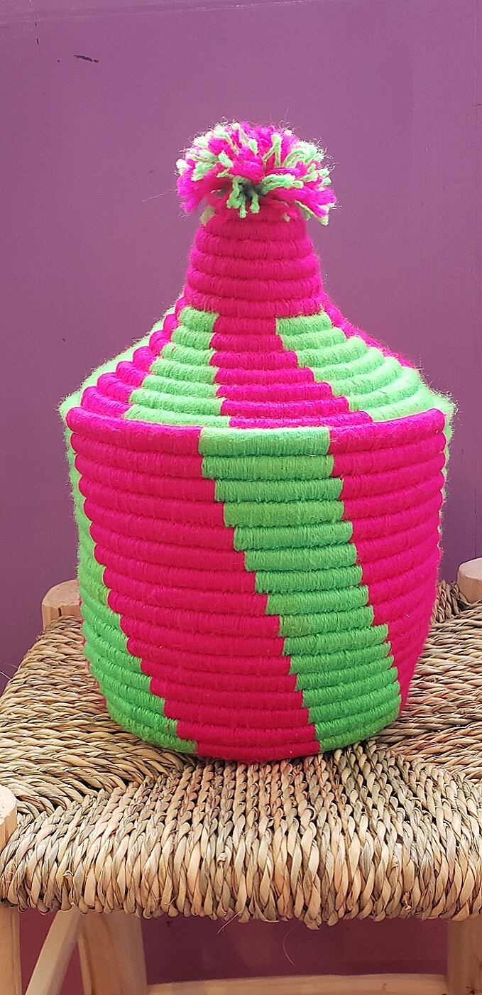 スマルという植物に毛糸を巻きつけてできているベルベルバスケット。