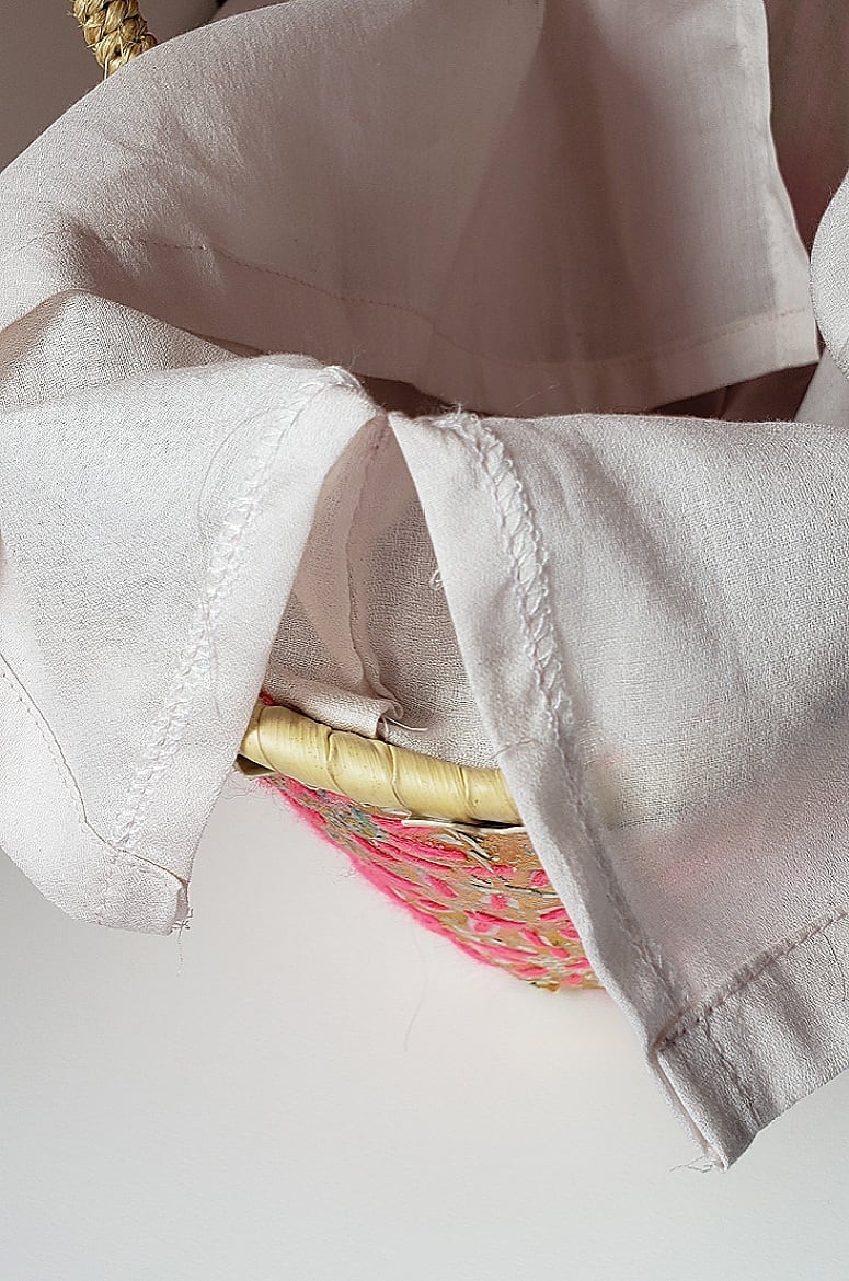 ベースはかごバッグにテーブルクロスのようなビニールナイロンを巻いてあります