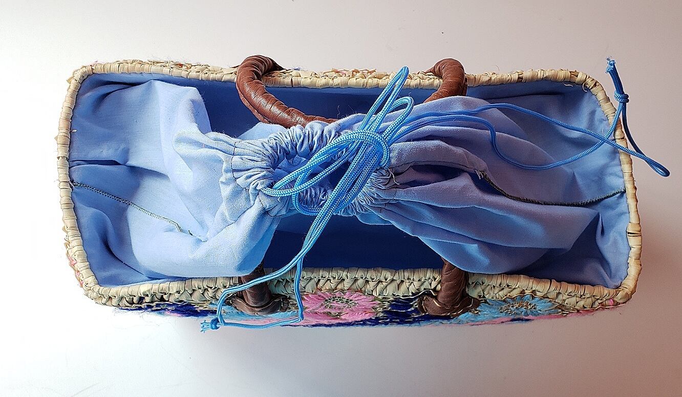 ベースはかごバッグにテーブルクロスのようなビニールナイロンを巻いてあります