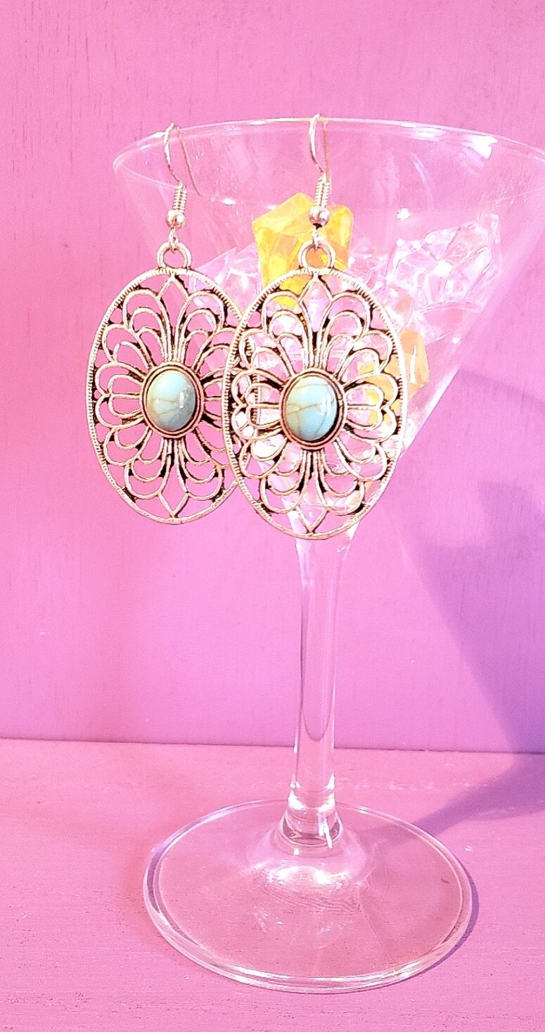 シルバーの金属素材に ターコイズ風の飾りがついたアラビアンデザインのピアスです。