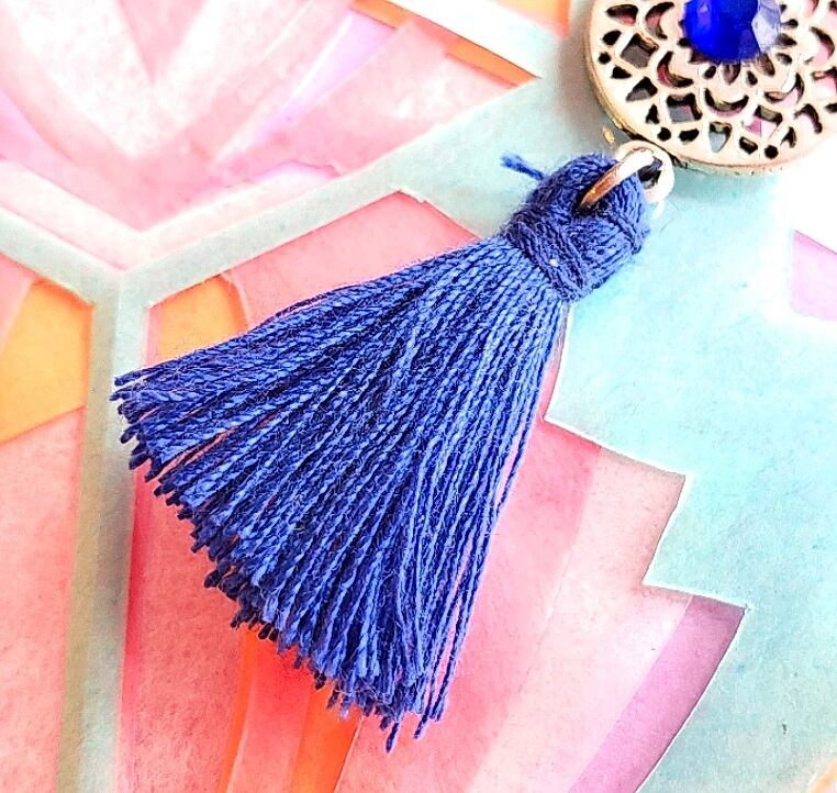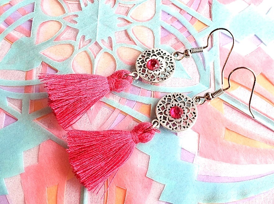 シルバーの金属素材に ラインストーンとコットンタッセルがついたアラビアンデザインのピアスです。