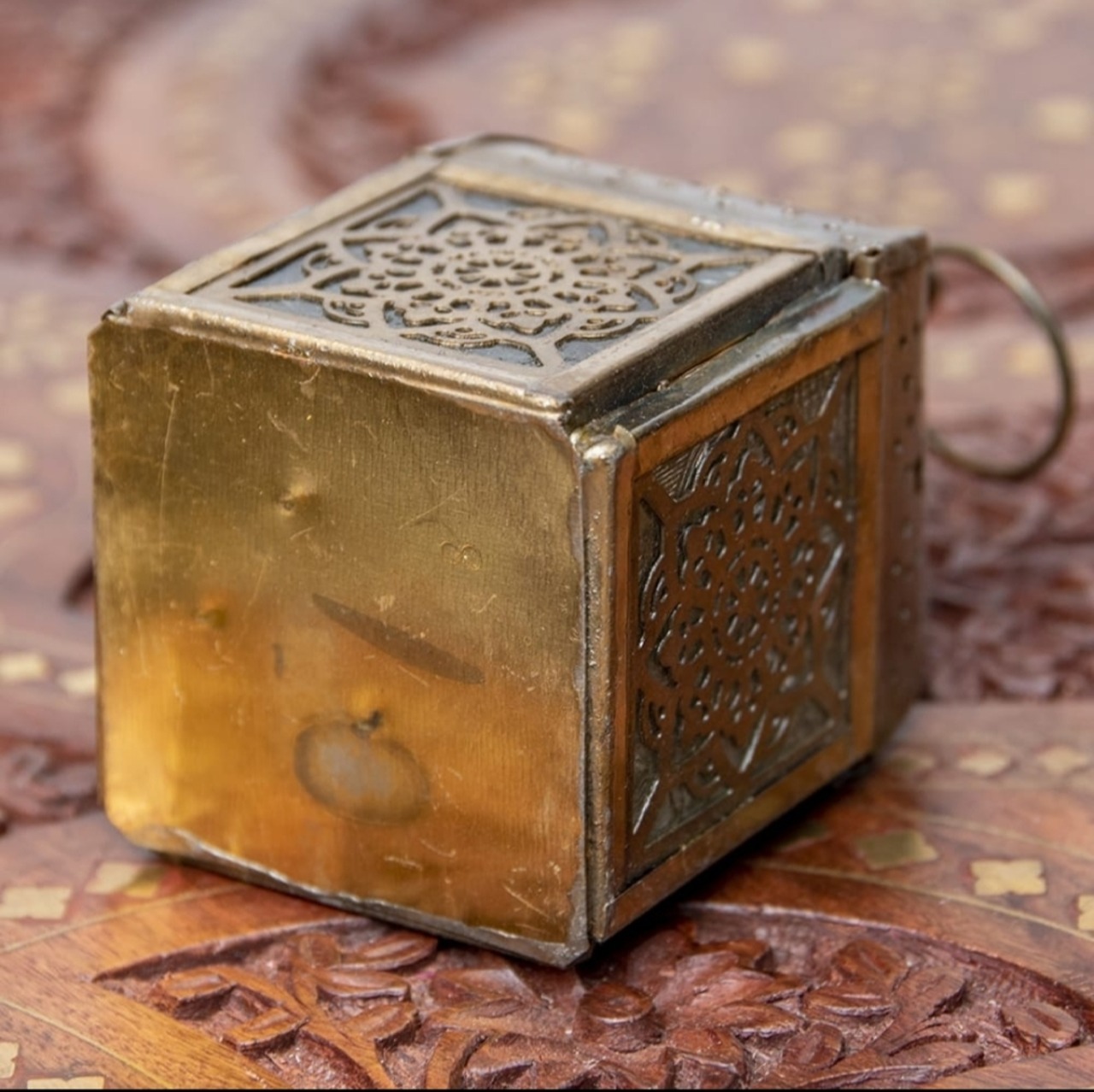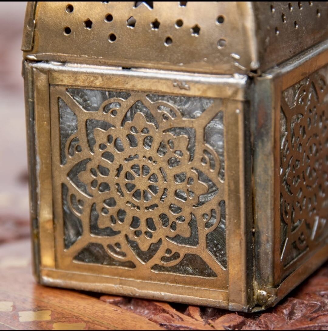 装飾の入ったガラスが周りに付いていて、ガラス越しに見えるキャンドルライトの明かりはとても綺麗。上部に開いている穴からも明かりがこぼれ、壁に投影される影を見ていると癒やされます。使っていない普段もガラスが綺麗でインテリアとして映えて素敵です。