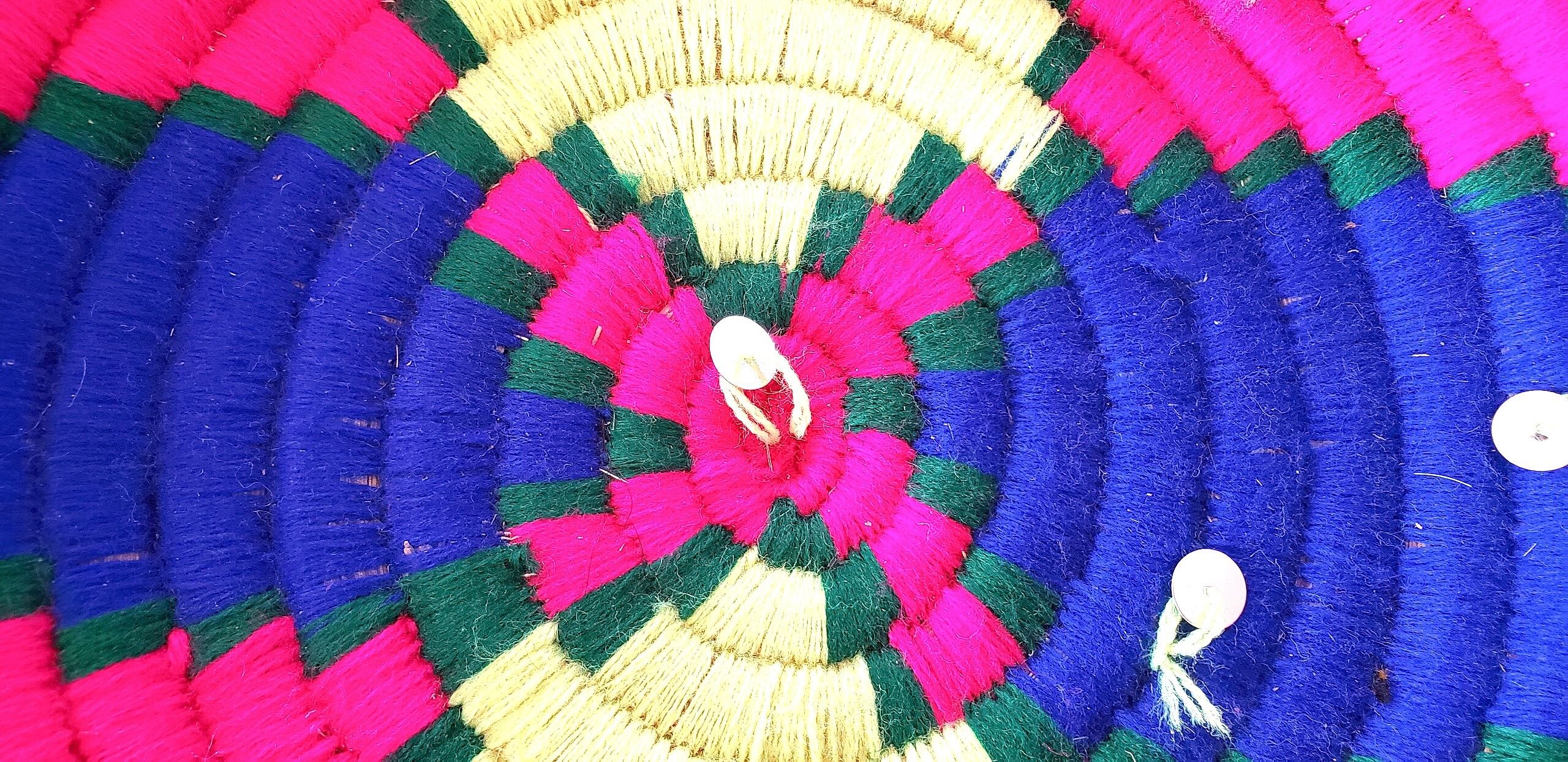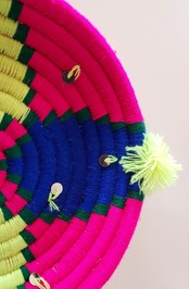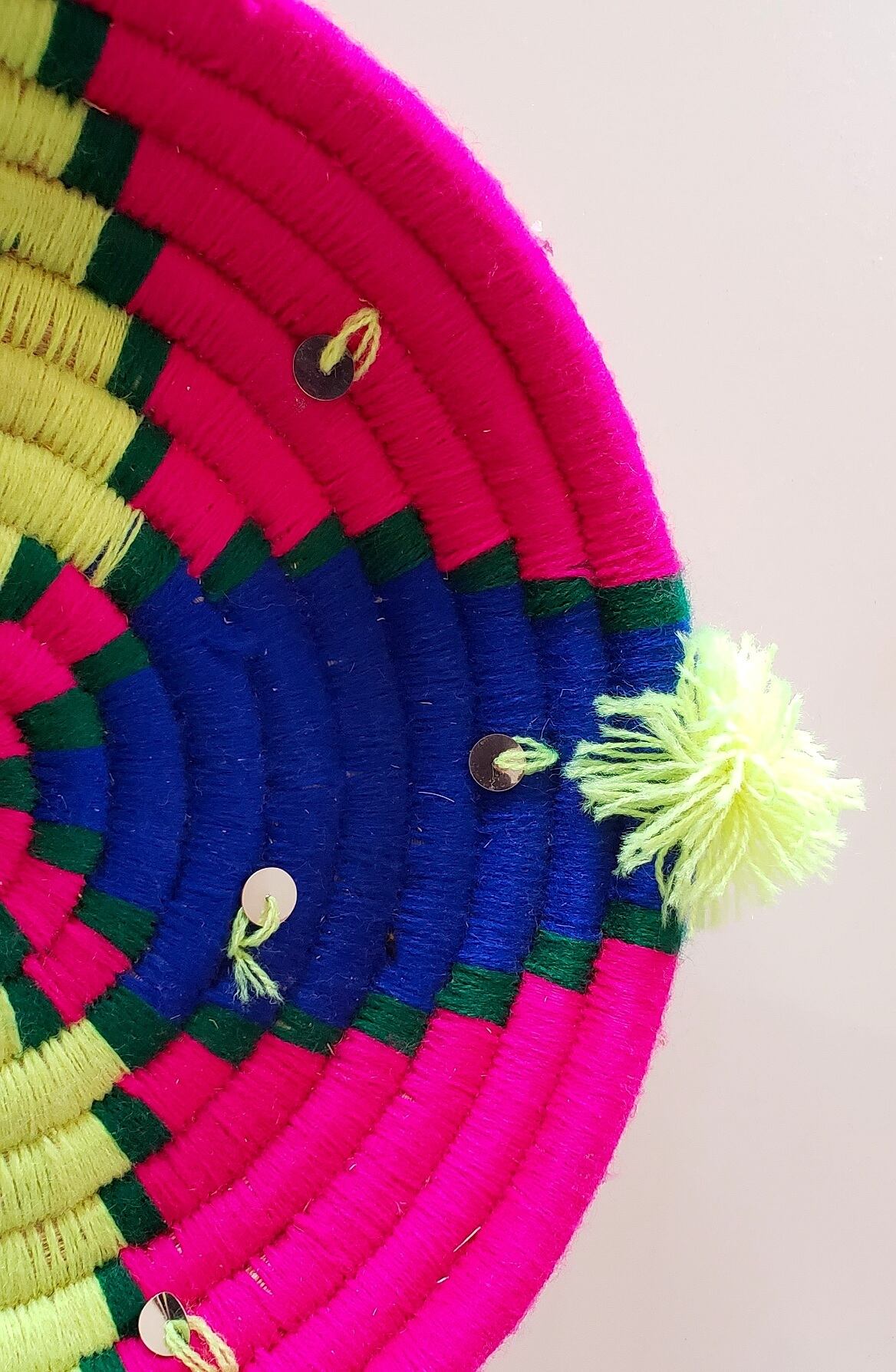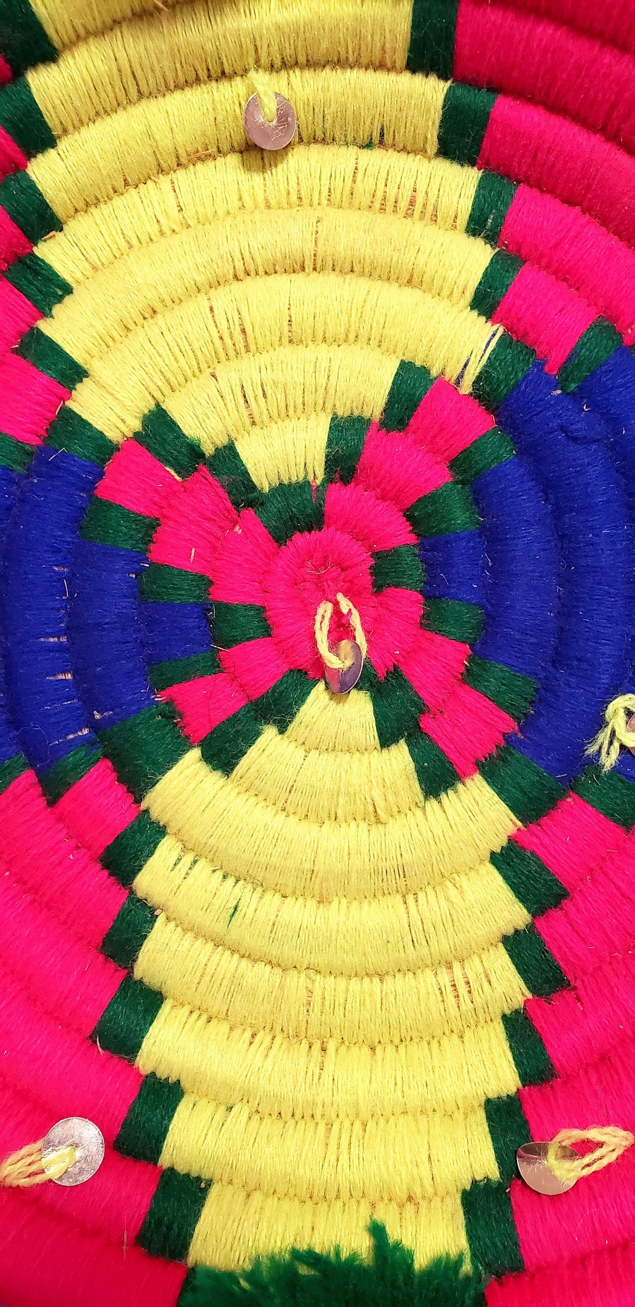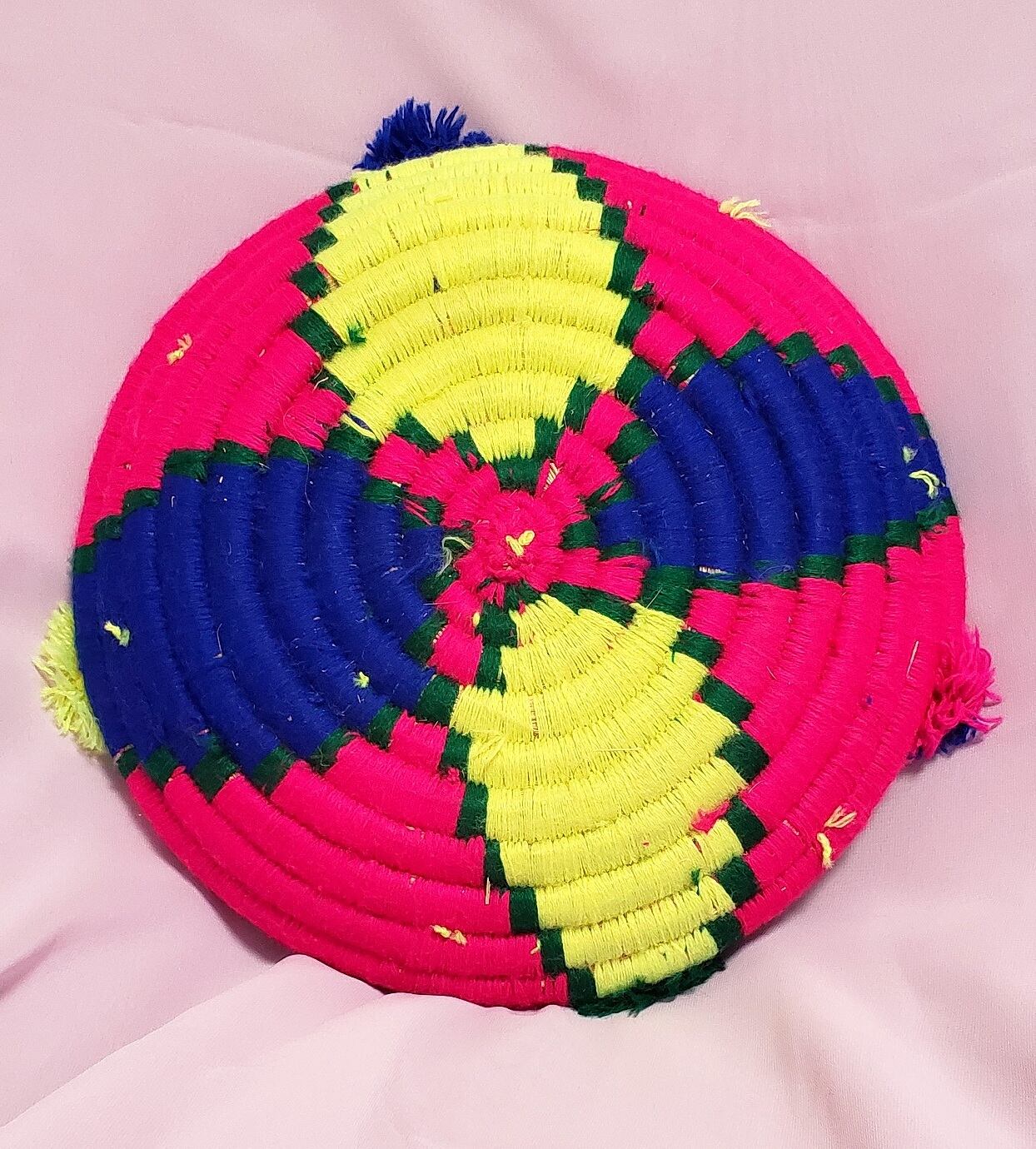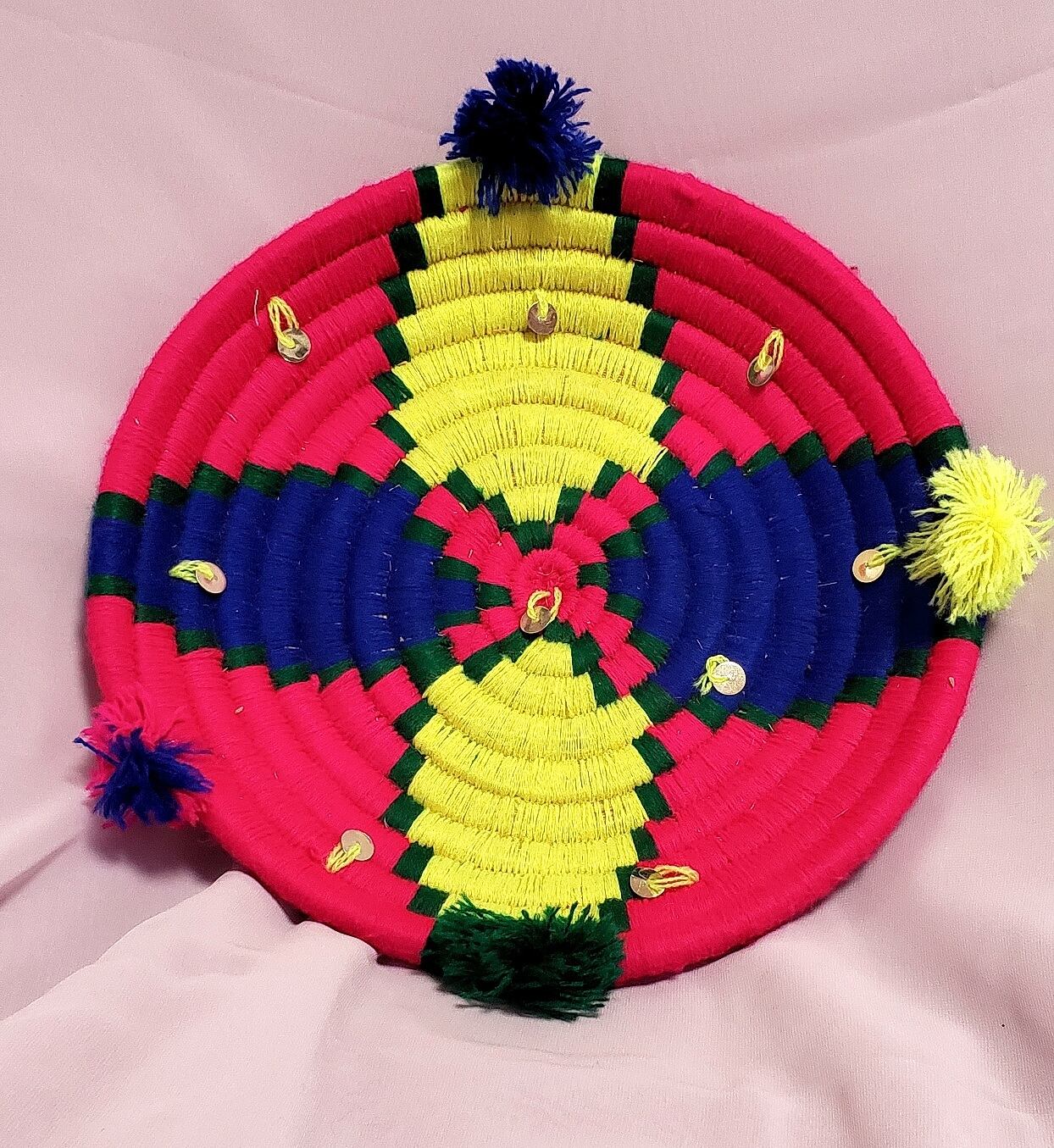 スマルと、呼ばれる植物にカラフルな毛糸を巻きつけて作ったバスケットトレイです。